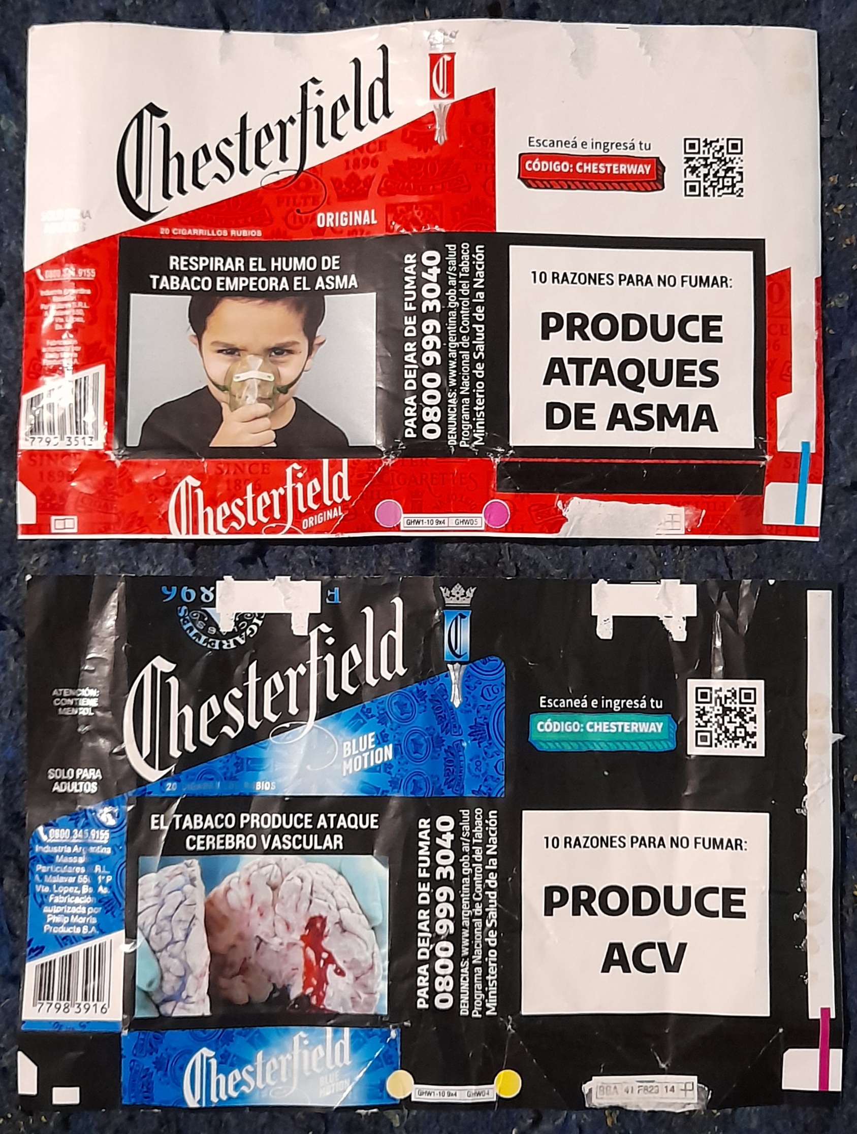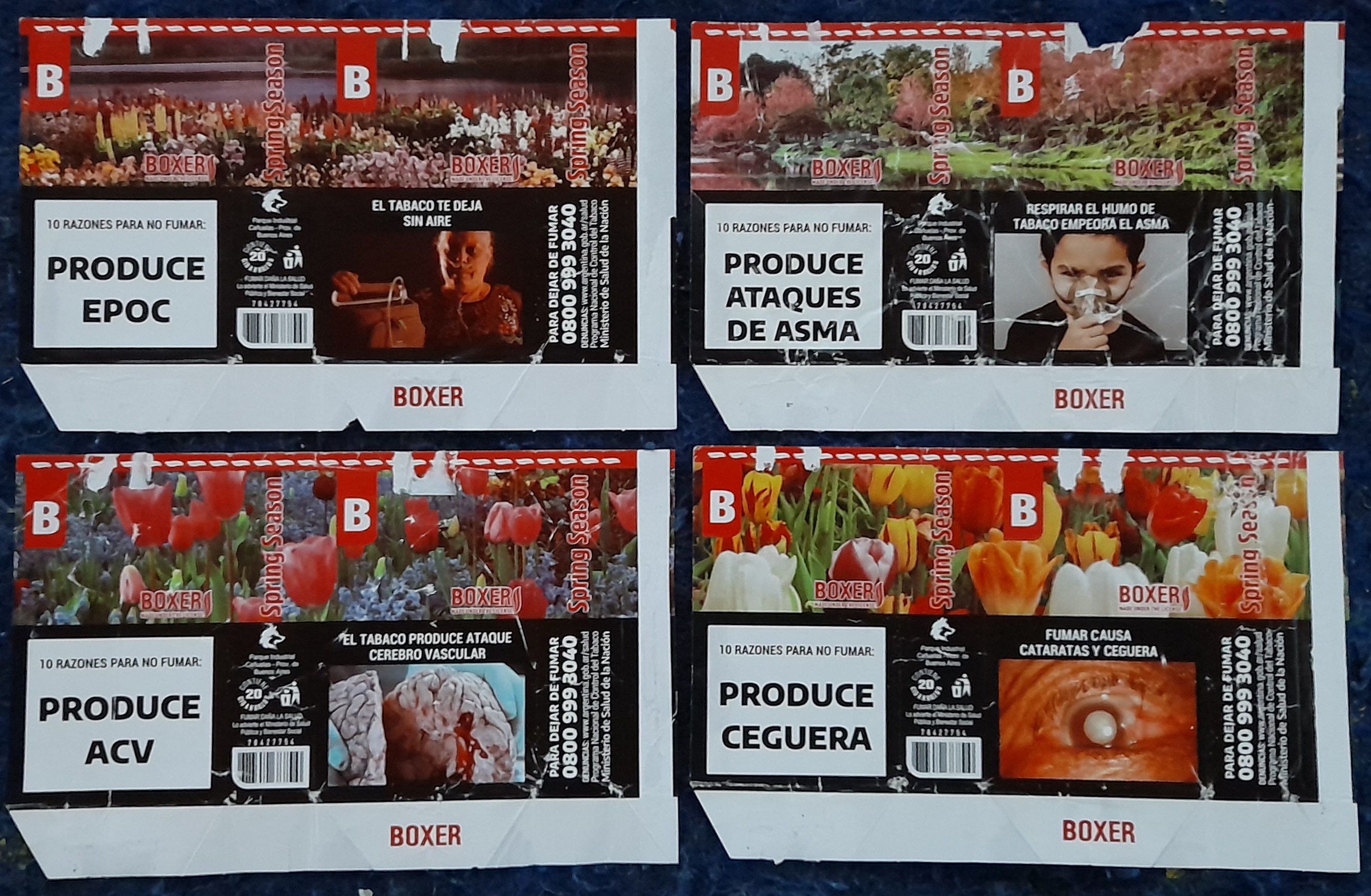 leyenda "escanea e ingresá tu código Chesterway" (Chesterfield) Boxer: La edición especial llamada Spring Season tiene 4 motivos diferentes.en soft packs de 20 cig. (Boxer) Cash: Están saliendo con nuevo diseño en soft packs de 20 cig. (Cash) Parliament: Las versiones hard box y super slims van a migrar a Marlboro Titanium Blue y Gold (Parliament) Philip Morris: Apareció una nueva edición especial llamada "Mister Felipe" en las presentaciones Red y Blue Spin (Philip Morris) Harmony: Cambió el diseño de las versiones Dorados y Colorados (Harmony) Boxer: La version Red cambió de diseño en las presentaciones soft pack y hard boxes de 20 cig. (Boxer) |